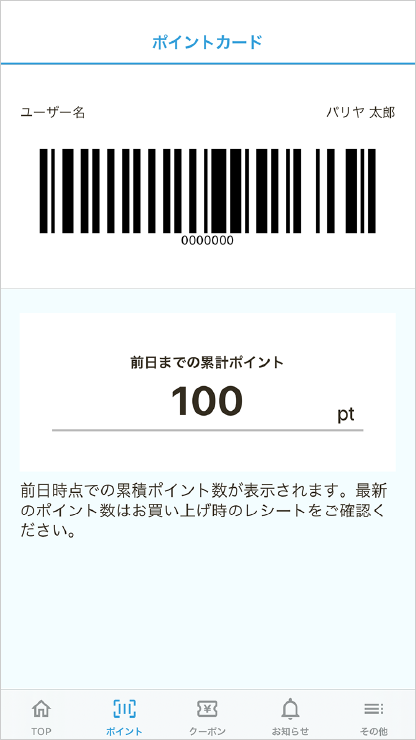 店頭で会員カード代わりに使えるモバイル会員証機能を実装。たまったポイントはアプリ上で確認が可能です。既存の会員システムとのデータ連携を行っています。