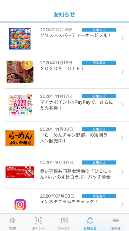 チラシ、お知らせ、クーポンなどの情報をプッシュ通知で配信できます。